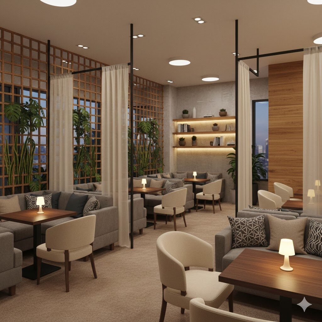 ホテルラウンジとは異なり面談専用の空間ではありますが、落ち着いて話せる環境として配慮されています。