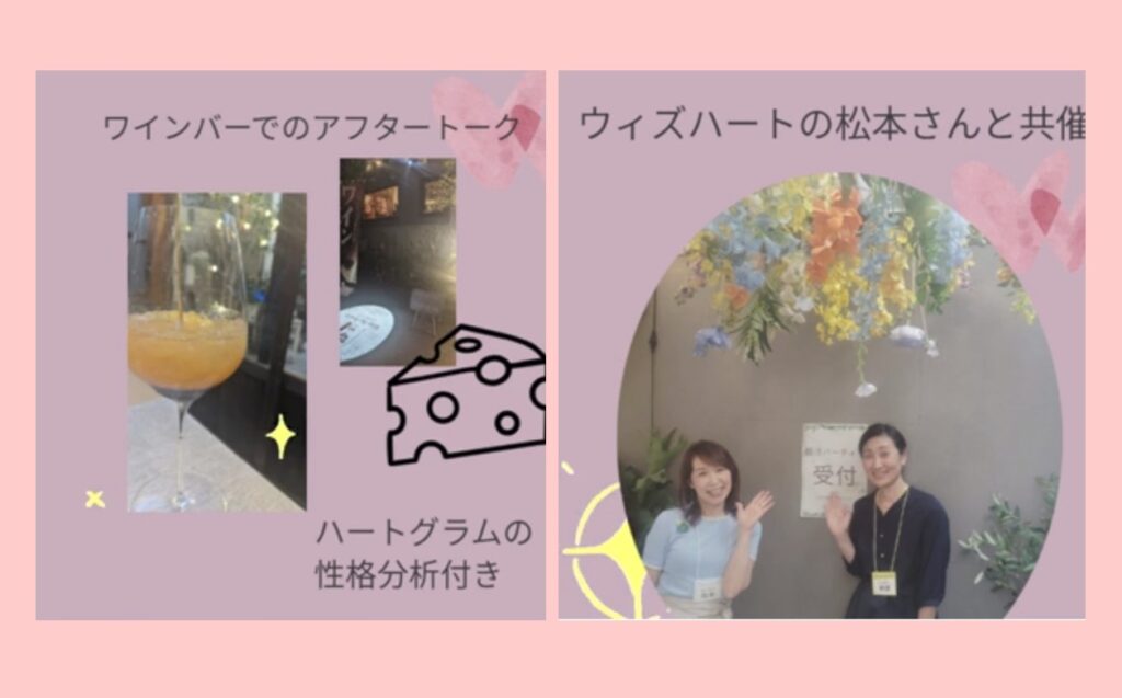 パーティーの後時間がある方は敷地内のワインバーでハートグラムの性格分析と婚活のお話で盛り上がりました。アンケートでは、また参加したいというご意見を多くいただきました。