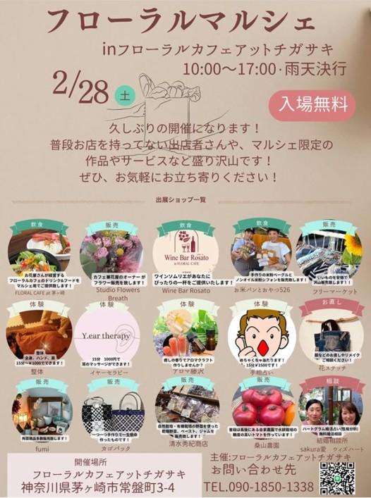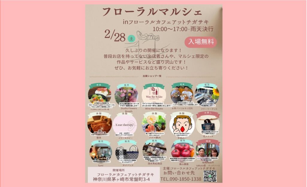 2/28(土)、茅ヶ崎のフローラルカフェで開催される「フローラルマルシェ」に参加します。